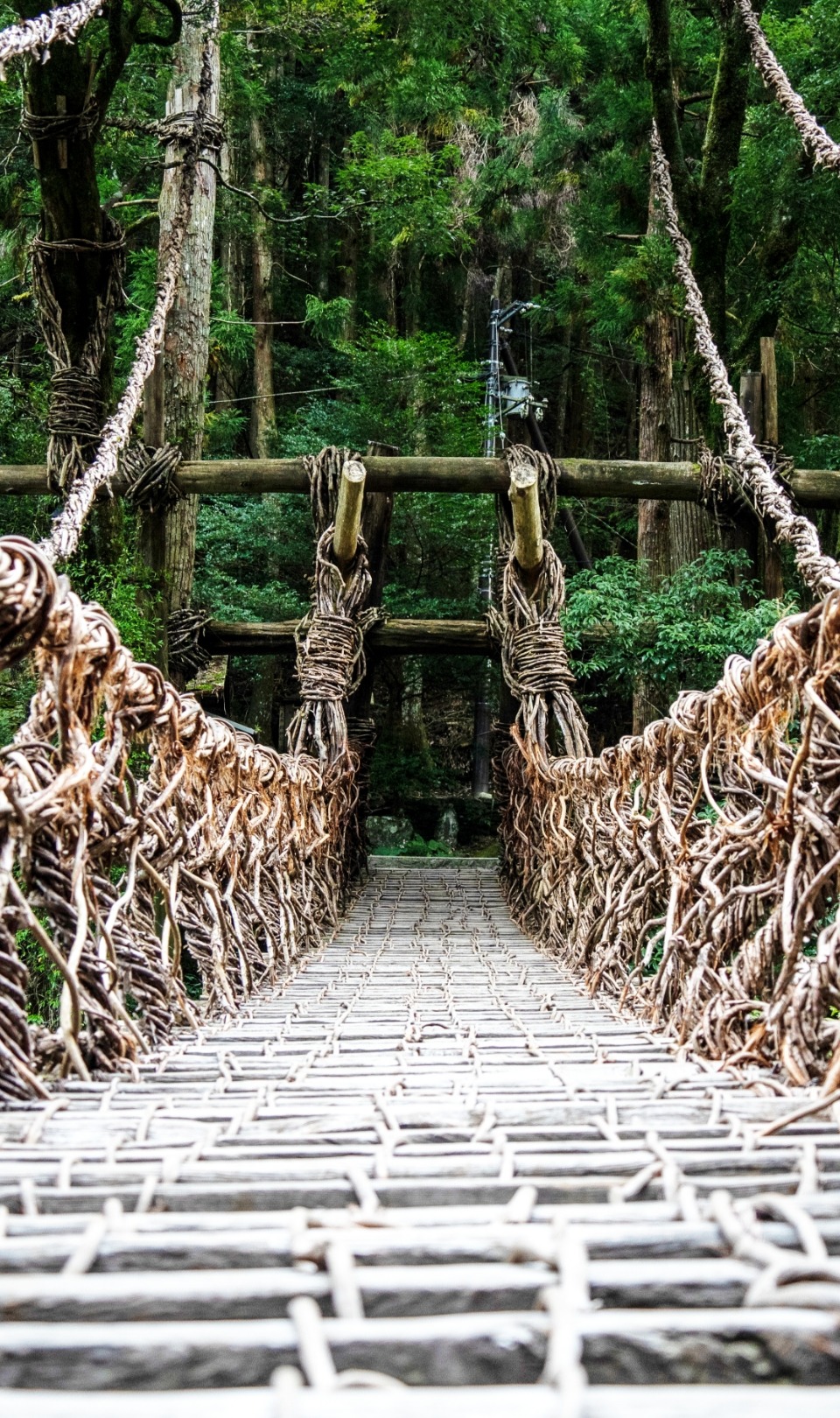 葛藤桥架在两岸的老树上,掩映在绿荫中,在微风中随风摇曳。其在祖谷川清流中倒映的悠然姿态,和