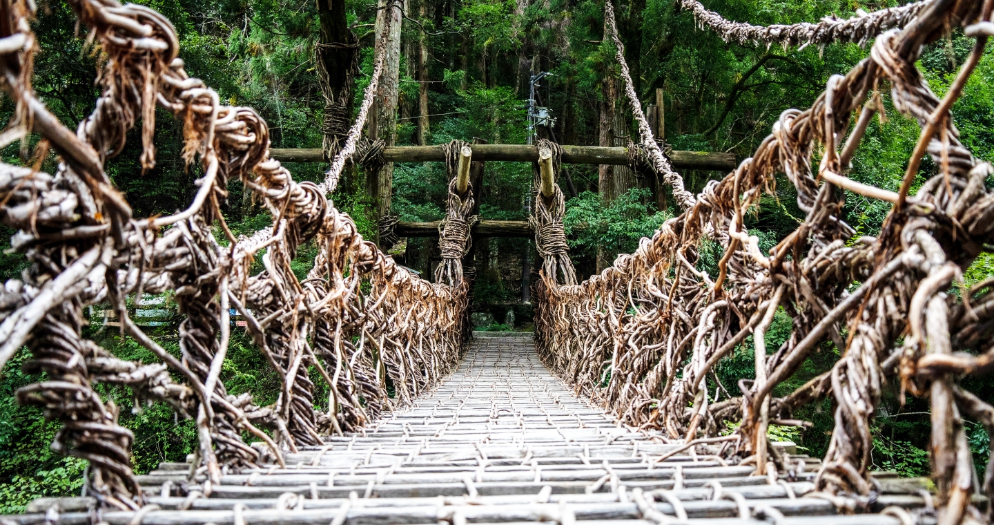 葛藤桥架在两岸的老树上,掩映在绿荫中,在微风中随风摇曳。其在祖谷川清流中倒映的悠然姿态,和