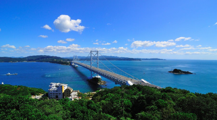 The 1,629m onaruto suspension bridge, which links Awaji Island with Tokushima, and the whirlpools in the strait can be clearly seen from the four observation platforms in Naruto Park.
