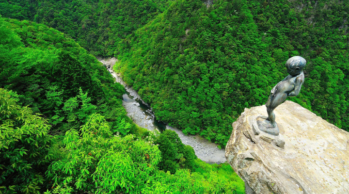 A dizzying succession of sheer cliffs lines a steep gorge carved out of the mountains by the Iya River. As a symbol of innocent courage, a statue of a peeing boy stands at the edge of a 200m precipice that is also noted for the seven curves along its rim.