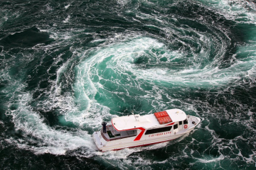 Visitors can see the whirlpools from a glass-floored bridge suspended 45 metres above the ocean, known as the "Tokushima Prefectural Uzu-no-Michi", or if they don't mind getting a bit wet, from aboard a whirlpool sightseeing boat. They can also gain splendid views of the sunlit Uchinoumi sea, passing ships, and the mountain-backed shores from the Naruto Skyline, Eska Hill, or Ohnaruto Bridge Crossing Memorial Hall Eddy. Views of the whirlpools can also be enjoyed while eating traditional Japanese confectionary and souvenir shopping at Senjojiki or the Tea Garden Observation Deck.