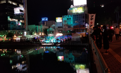많은 가수 및 성우들이 신마치가와 강을 배경으로 라이브나 토크쇼를 여는 신마치바시 히가시 공원 스테이지. 행사가 진행되는 3일 동안은 일본 각지에서 애니메이션 팬들이 대거 모여 듭니다.