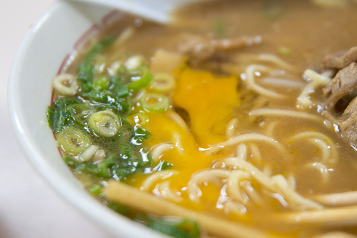 現在,讓我們來看一下徳島拉麵的視覺吧!首先,你會注意到的是中央的生蛋。是的,作為徳島拉麵最基本的配料之一,就是這個生蛋。有些店也有水煮蛋的選項,但大多數徳島拉麵店都會使用生蛋。為什麼會使用生蛋呢?我認為,只要嘗試一下就能理解,但讓我來解釋一下我的看法。徳島拉麵外觀看起來非常濃郁。對於一些人來說,單吃的話可能會覺得口味太濃郁。在這種情況下,能使徳島拉麵的風味更加柔和的就是生蛋了。